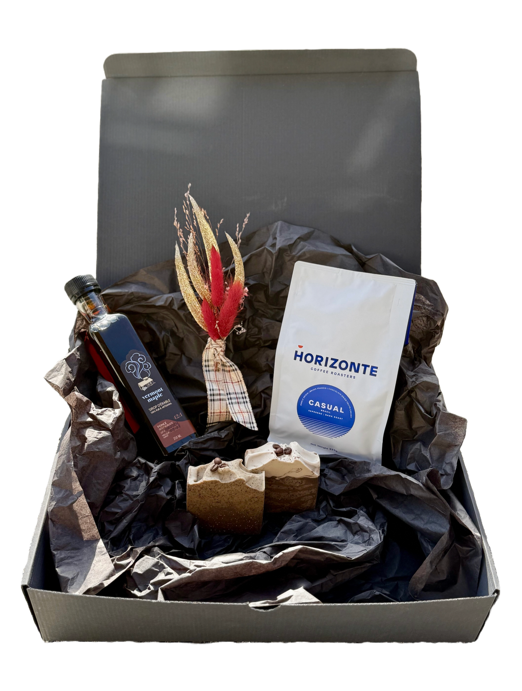 This Christmas gift box includes a 333g bag of our Casual coffee, 250 ml of real Vermont maple syrup, and two handmade exfoliating coffee soaps. Everything is thoughtfully put together with local craftsmanship and a personal touch — ready to go under the Christmas tree.