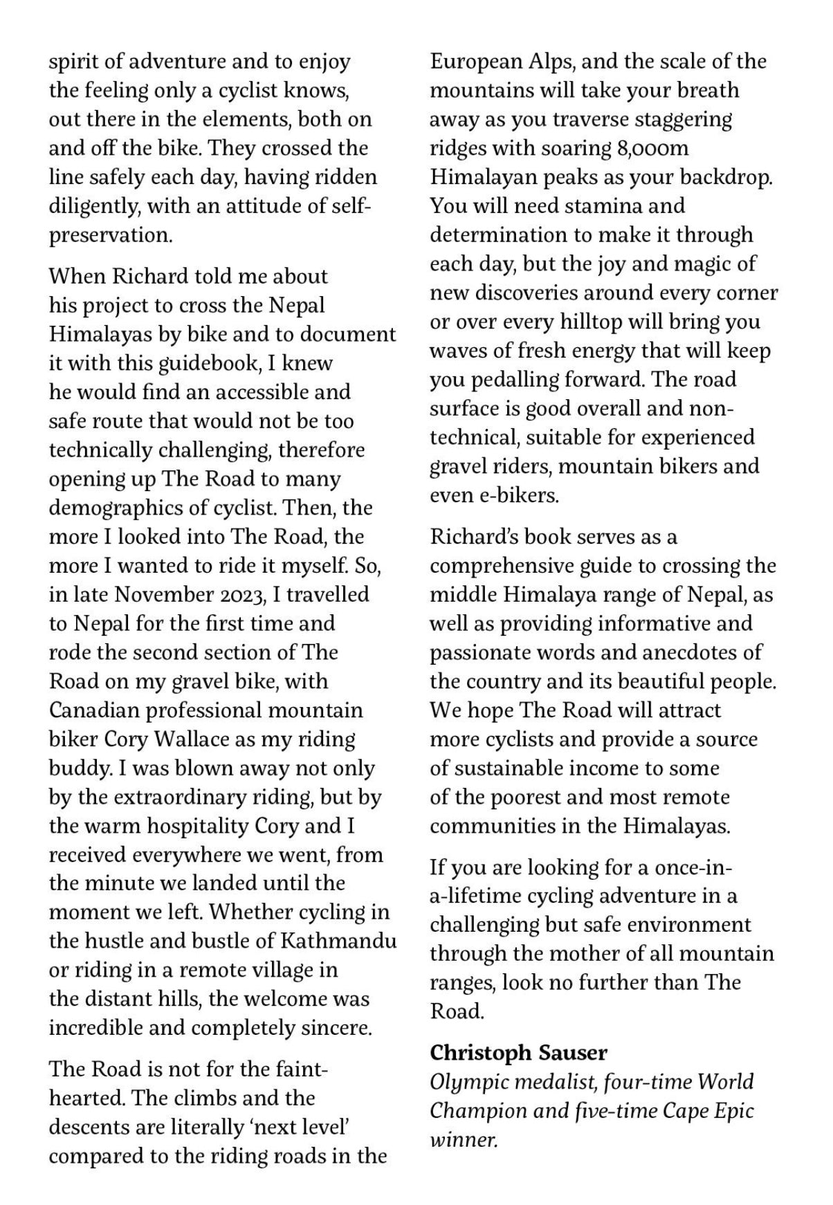 Part guidebook, part travelogue, but all adventure! Join author Richard Williams and photographer Manish Maharja as they traverse the Nepalese Himalayas on mountain bikes. Christoph Sauser, who completed the second part of the route, is absolutely stunned by the route, the people, and the adventure it entails. With this book, anyone can complete the route or embark on part of it. It serves as your gateway to an unforgettable biking journey in Nepal.
